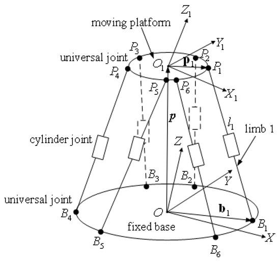 In this section, the relationship between the structural errors and end-point errors of a 6-UCU kind GSP is discussed. The 6-UCU kind GSP consisted of a moving platform, a fixed base, and six limbs, as shown in Figure 1 and Figure 2. The ith limb was connected to the fixed base via a universal joint, whose joint center point is denoted as , and connected to the mobile platform via a universal joint with center , as shown in Figure 2. For convenience, a Cartesian coordinate frame, , was attached to the moving platform with origin . A Cartesian coordinate frame, , was attached to the fixed base with origin .