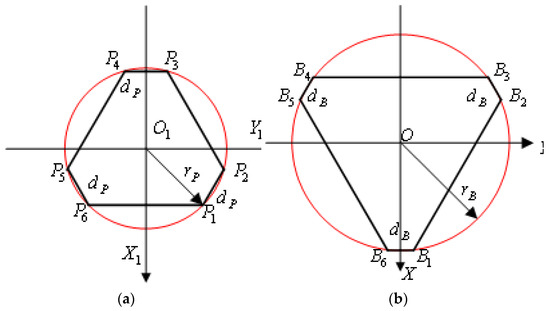 The positions of the universal joints attached to the moving platform and the fixed base of the GSP formed semi-hexagons, as shown in Figure 3, where is the radius of the platform-joint attachment circle, is the distance between the shorter edges of the attachment point semi-hexagon on the moving platform, is the radius of the base-joint attachment circle, and is the distance between the shorter edges of the attachment point semi-hexagon on the fixed base.