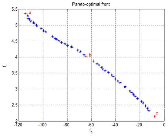After applying the proposed optimization process, as outlined in Section 3, 50 optimal solutions and the Pareto-optimal front were found, as shown in Figure 4. Lastly, there were three optimum design points, labeled as a, b, and c, whose corresponding objective values and design parameters are shown in Table 4. As seen in Table 4, the maximum errors of all the linear displacements were lower than 1 mm, and the maximum errors of all the angular displacements were lower than 0.1°. Therefore, all the requirements by the customer, given in Table 3, were met. This showed the effectiveness of the proposed method for the optimal design purpose.