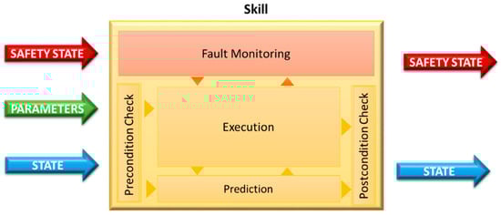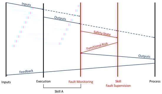 The fault monitoring of Figure 3 resorts to a different set of primitives, e.g., fault detection, fault location, skill reconfiguration or verification of a system’s results. Safety primitives are different in nature and thus usually provide a qualitative or quantitative characterization of the safety status of the hardware and software components. For this reason, the specificity of these primitives is inherent and dependent on the abilities defined by the skill (through the execution process), as well as the harm that potentially rises from their errors—a causality analysis should be determined by considering hazardous situations that could happen in the context of that skill. The fault monitoring process aims to reduce the risk expected for that specific skill and, therefore, provides safety features by running the monitoring process continuously in parallel with the remaining execution of the operational primitives. This fault monitoring estimates the safety state of the skill, which is defined by the availability and quality (which defines the dependability) and the potential failure severity of the service delivered by a component module (skill).