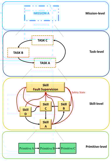 This model provides task-level programming based on lower level entities, called skills, which instantiate actions or sensing procedures. In this way, complex behaviors can be described in a more systematic and flexible manner, as well as, the effort to program new mission types is lower and the usage of primitives creates a hardware abstraction, which turns the task specification/program completely reusable; however, it is not clear how safety monitoring modules, fault supervision or even fault tolerance strategies can be incorporated.