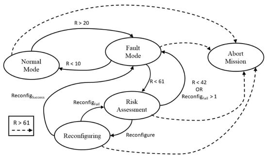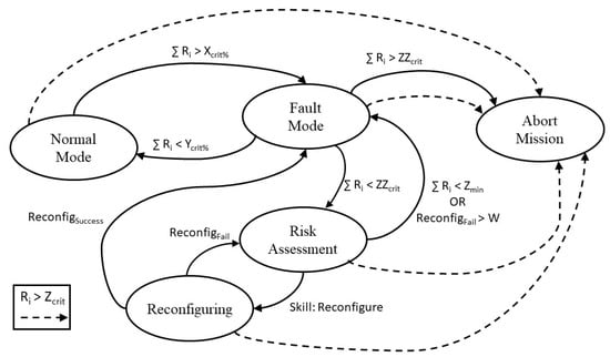Considering, for example, an intermittent fault in the thrusters; all primitives will have Persistence(i) = 1 and Availability (i) = 2. That would mean that the Safety State of Line, Rotation and AccelerationControl would be, respectively, 24, 8 and 60. As a skill’s Safety State mirrors that of its worse primitive, GoTo would be 60. Thus, the decision-making would not deem it sufficient reason to abort the mission, but would enter Fault Mode and then proceed to Risk Assessment. As the level is Serious, it is above Zmin (Serious starts at Safety State = 43 and Z min is 42). The system does not have enough redundancy to reconfigure Hardware, so it may only try to reconfigure Software. In this case, it could try to change the Nominal Velocity parameter, or even the internal parameters of the AccelerationControl primitive. Let us assume it tried to change the Nominal Velocity, cutting it down by half. This does not change, in this case, the Safety State of the GoTo skill. However, it is a protection measure that allows the system to continue operating in the Fault Mode. But should the /timeout for the mission be reached, then the Safety State would change. Since AccelerationControl was already at the upper Serious level limit, we can easily start by calculating that and we will reach a Safety State of 96. This means its level is now Fatal. Since the skill assumes the Safety State of the primitive with the highest value, we now know that every possible value for GoTo skill places it at Fatal level, and therefore the mission is immediately aborted (such as would be the need in this case considering it is highly possible that the system cannot move at all). This state machine is illustrated in Figure 9.