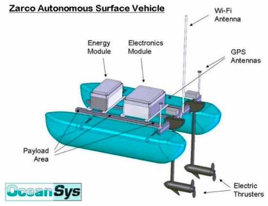 The Zarco is equipped with motion actuators, i.e., actuators that allow it to move, in the form of two electrical thrusters in a differential configuration. Next, an energy module composed of lead-acid batteries is the power source. Moving to sensors, Zarco only has value sensors, i.e., sensors that return a value or a set of values and which concern variables like positioning, acceleration or velocity. These include a pair of GPS receivers (L1 + L2 RTK), an Inertial Measurement Unit (IMU) and a magnetic compass. The navigation and communication, in terms of hardware, are based on an onboard computer and a Wi-Fi antenna and, in terms of software, into the functions that allow for autonomous mission completion and communication with the Ground Control Station (GCS) [37].