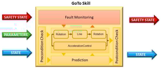 Although the conceptual model of skills [29,34] is being developed for industrial robots (mainly, for human-robot collaboration), it can be extended for mobile robots by incorporating a safety monitoring model. The control architecture can be formulated by a set of building blocks that define high-level capabilities that are installed in the robot. These building blocks define a program or a specific task that can be conducted in a controlled manner (with parametrization attributes, feedback and self-adjusting routines) and that which allows the robot to complete missions (a set of tasks). Thus, this conceptual model defines (see Figure 2):