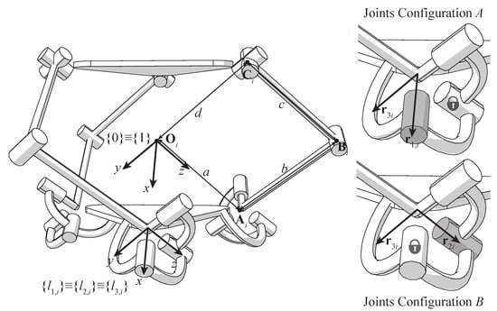 The rest of the kinematic chain of each leg is composed by a revolute joint, parallel to the last revolute pair of the reconfigurable spherical joint at a distance b, and by a universal joint that connects the second link of the leg to the end-effector. As demonstrated by Palpacelli et al. in [23], the arrangement of the last joint of the chain is also crucial for the definition of end-effector’s mobility. In particular, for the reconfigurable 3-URU parallel robot, the last universal joint is arranged so that the first rotation is parallel to previous revolute joint at a distance c, thus it is perpendicular to the leg plane (identified by points , , and ). The second rotation lies on and is perpendicular to the previous one; on the end effector, such axes are mutually perpendicular and concurrent at the origin of the moving frame . Moreover, such axes coincide with the axes of . With respect to such reference frame, the three attachment points are identified by vectors , , and .