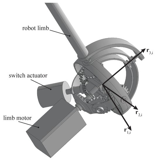 Such considerations led to a different functional design of the spherical joint, based on a series of spherical links connected by a system of gears, as described in this section. Globally, the mobility is characterized by a rotation of the limb around that is always free; such rotation is preceded by a first rotation, whose axis can be selected among or acting on the switch.