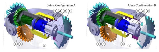 Nut-screw switching mechanism arranged for Joints Configuration A (a), and for Joints Configuration B (b).