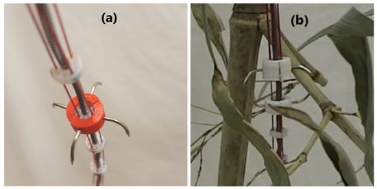 Specialized hardware for adaptive attachment of tendril robots for environmental support increases mechanical complexity and diminishes its ability to maneuver in congested environments. Hence, we designed attachment hardware with the same general scale of the hook prickles, but with better performance. The overall design is still sized to fit around a spacer and has several variations depending on which section’s spacer is is meant to be placed. The hooks are small diameter metal nails bent into the appropriate shape, which is typically between 90 and 120 . The size of the hooks is empirically determined to be wide enough to grasp meaningful environmental features, while small enough to allow the robot to enter the environments, particularly the Space Station equipment racks, which were our application focus for this work. One new design, shown in Figure 3a, features four hooks, rather than two. These hooks are separated by approximately ninety degrees, in order to minimize the necessity of precisely orienting the robot in order to engage the environment; thereby facilitating a higher probability of making contact with un-sensed environmental features, which we found to be the case during experiments. The second design, shown in Figure 3b, was a different approach that was meant to improve the contact quality. In either design, attachment and detachment are achieved by manipulating the length of the section that has the set of prickles. For the second design, where a set of prickles is on the first spacer of the tip section, and the last spacer of the middle section, the middle section is extended, while the tip section compresses. Both designs were manufactured in our laboratory by 3D-printing a structure to fit around a spacer with holes through which metal nails can be placed for the prickles.