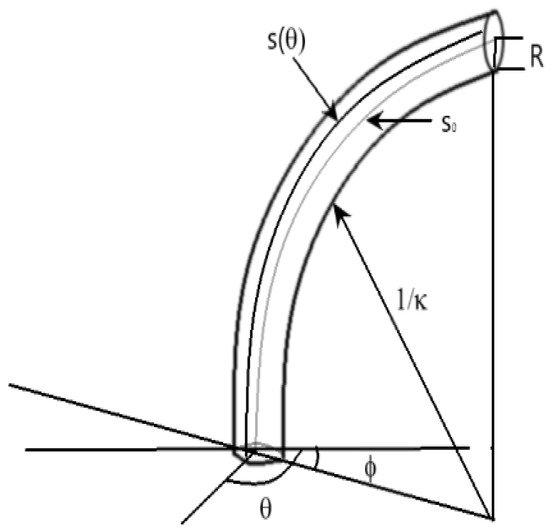 Note that, at orientation ϕ ( 0 ) , the constant curvature assumption implies that the section centerline is a circular arc with radius r = 1 / κ 0 , and defining γ , the angle subtended by the arc, via: