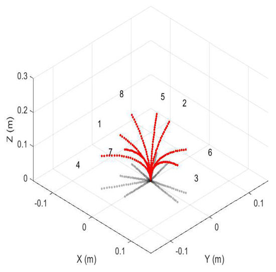 Figure 5. Circumnutation simulation showing the projection of the robot on the base (x,y) plane, showing the change in tip distance from the z-axis for a single section over eight time steps.