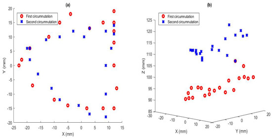 Figure 8. (a) Trace of the tip as it circumnutates, seen from the top. The red circles are the path during the first circumnutation, and the blue crosses are the path of the second circumnutation. (b) Trace of the tip as it circumnutates from a three-dimensional perspective.