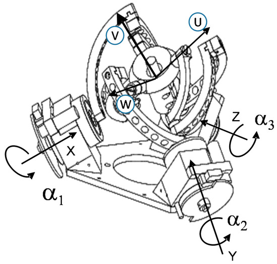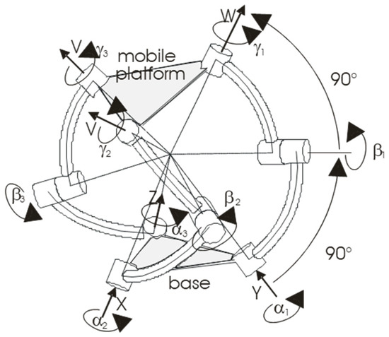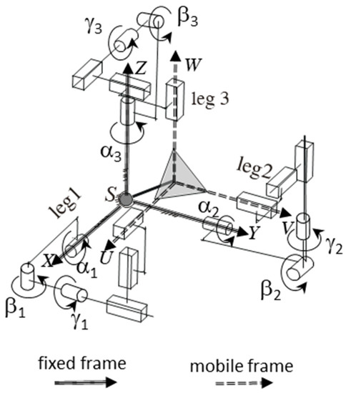 To study the mentioned spherical PKM, a fixed frame and a mobile frame were established, as shown in Figure 1, Figure 2 and Figure 3. To simplify the analysis, the coordinate axes are chosen coincidently to the rotation axis of some revolute joints. The XYZ axis of the fixed base frame are parallel with the axes of the actuated joints, while the UVW axes of the mobile frame are parallel with the axis of the joints γi of the mobile frame. The inverse kinematics of the considered spherical PKM can be solved by realizing that the joints of each leg constitute a Cardanic sequence. With reference to Figure 3 and Figure 4, we get: