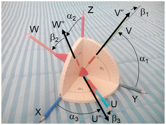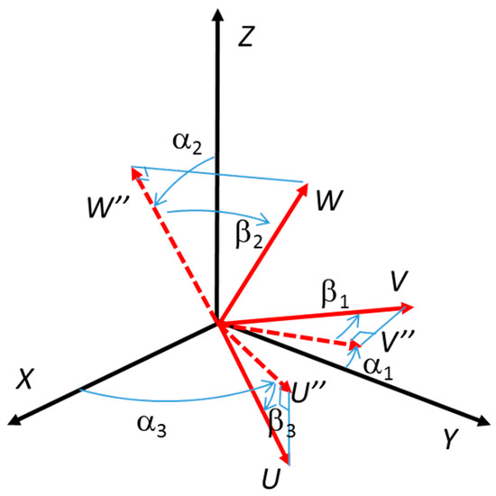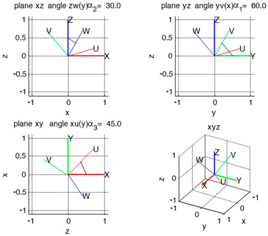 We indicate by X, Y and Z the fixed axes, and by U, V and W the mobile axes (Figure 4, Figure 5 and Figure 6). The rotation matrix is then: