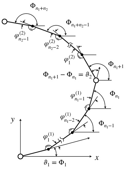 To model this system, we consider a lumped-parameter discretization. Since the manipulator is made up of two links, which can be modeled in the range of large deflections by the elastica theory, we adopt the well-known Hencky technique [28,29,43,44,45] to discretize the system and, then, using a more comfortable Lagrangian mechanical system, to study the motion of the robot and to design the trajectory tracing. Therefore, the considered discrete system consists of two articulated chains of rigid rods of length connected to each other by means of zero-torque hinges, also known as ‘pseudo-joints’. At each joint of the same link, a rotational spring is placed in order to model the resistance to being bent of the arm (see Figure 1). In other words, the torques provided by these springs represent the spatial discretization of the internal actions of the links, namely the bending moment. The Lagrangian coordinates, which describe the configurations of the manipulator are (with ). In particular, they represent the orientation of the rigid rods with respect to the x-axis. Moreover, the following definitions are useful to specify the angles of the actuation: