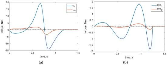 Parabolic trajectory case: (a) reference rigid torques; (b) correction torques.