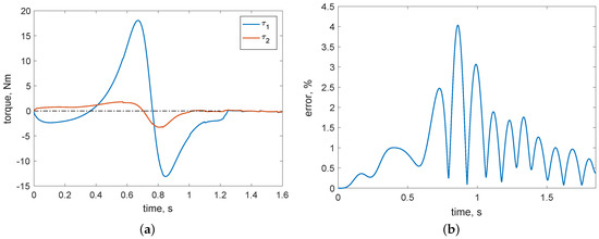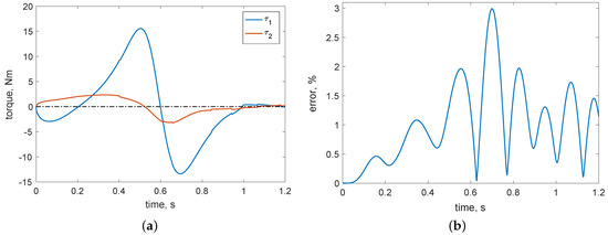 Parabolic trajectory case: (a) actual torques; (b) relative tracking error for the tip.