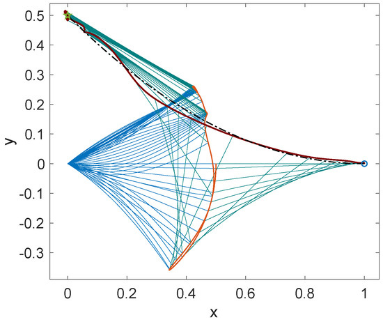 In particular, Figure 4 and Figure 6 show the reference path (dashed black line) for the tip of the arm in which the start and end points are highlighted with a circle and a star, respectively. These figures also exhibit the actual trajectories of the two ends of the links, as well as some intermediate deformed configurations for the links. The deformations of the links are clearly in the range of large deflections, and therefore, any linearization procedure is not allowed in the investigated cases.