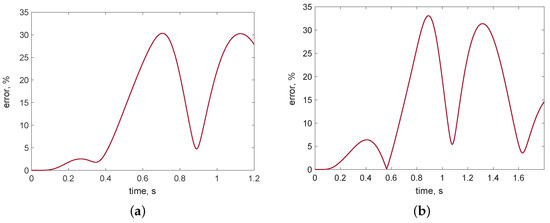 To estimate the efficiency of the proposed approach, we compare the used control strategy with a standard PD control with a feedback of the angular joints using a desired trajectory evaluated for the linear and parabolic rigid cases, respectively, Equations (20) and (22) and the time law (21). Figure 8 shows the relative tracking error of the manipulator tip in both examined cases with the PD feedback gains: Nm, Nm, Nms and Nms. The tracking performances obtained exhibit a maximum relative error of about 30%, much greater than the optimal pre-shaping input approach.