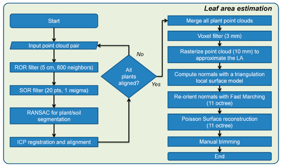 Finally, in order to estimate the LA, a mesh was generated by using the Poisson reconstruction method. The Poisson surface reconstruction is a global solution that considers all the data at once, and creates smooth surfaces that robustly approximate noisy data [24]. The octree depth was the main parameter to be set; the deeper the octree the finer the result, with the drawback of taking more processing time and memory. Although in this research an octree value of 11 was set for a more detailed reconstruction, a smaller value would not affect much the leaf area measurement. After a triangular mesh was generated with the Poisson surface reconstruction, the LA was calculated by simply adding the area of all the individual triangles.