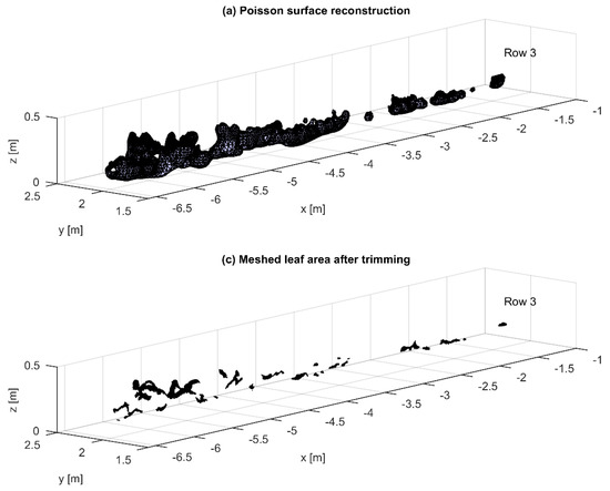 A characteristic of the Poisson reconstruction (see Figure 5a) is that it produces a watertight surface, which was not suitable for this study’s dataset where leaves were separated [25]. In order to trim the reconstructed surface to fit the point cloud (see Figure 5b), a surface trimming algorithm was applied [26]. This method pruned the surface according to the sampling density of the point cloud. The disadvantage of this algorithm was that, for non-watertight surfaces such as the leaves in this dataset, it was difficult to find the right parameters to trim the mesh. This problem was approached by identifying the biggest leaves in this point cloud and manually trimming them until the reconstructed surface fit the silhouette of the biggest leaves of the row point cloud. This parameter value was interactively found by removing the triangles with vertices having the lowest density values, which corresponded to the triangles that were the farthest from the input point cloud. If the trimming was done beyond the point cloud limits, the reconstructed surface started to shift the leaf border beyond the real one, thus producing overestimated values as reported by Paulus et al. [13]. In addition, the density value was reduced if a mesh membrane was generated between leaves with close spatial proximity, because this effect would generate an overestimated LA value.
