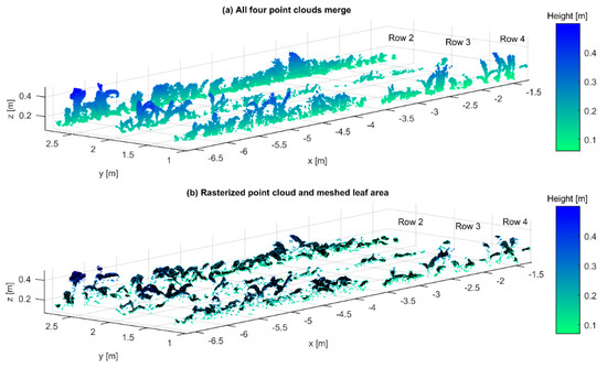 Table 1 shows that the RMSE and MAPE were 231 cm2 and 8.8%, respectively. This error was relatively small because the rasterized point clouds were well defined and they also had a relative continuity without duplicate points in the z-axis. In Figure 7a, the plants are thicker than they are in reality due to the error accumulated during the reconstruction of the maize row and the alignment and merging of the four point clouds. The rasterized point cloud and its meshed representation are shown in Figure 7b. With the mesh, it is possible to add the area of the all the triangles to know the total LA.