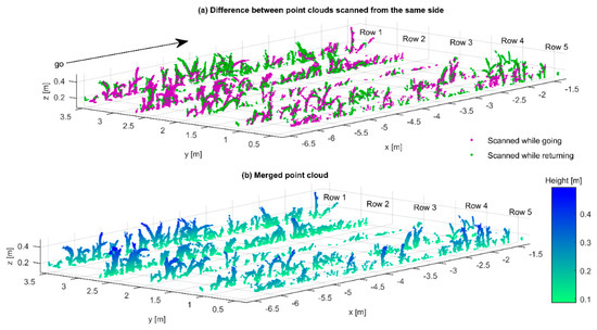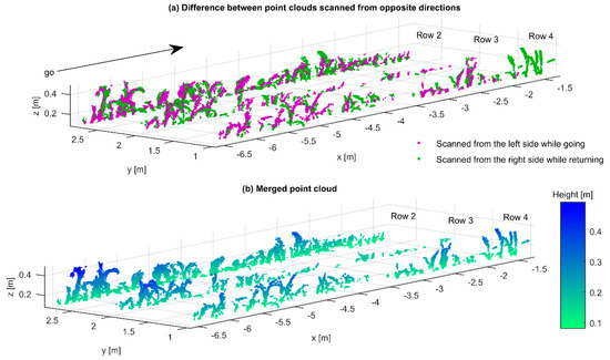 Opposite direction scanned point cloud acquired (a) from the left and right side of the crop row and (b) after merging.