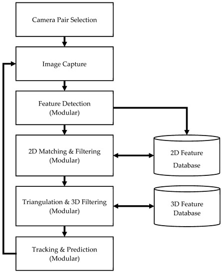 A novel, modular methodology is proposed herein for the surface deformation prediction of an a priori unknown object through a multi-camera system. The flow diagram of the proposed methodology is presented in Figure 1. The first step of the method is the selection of camera pairs for stereo triangulation. Once the pairs are selected, the following tasks are carried out for each demand instant: (1) image capture from all cameras, (2) feature detection, (3) 2D matching and filtering, (4) triangulation and 3D filtering, and (5) tracking and prediction. The modular tasks, (2) to (5), enable robust implementation of the methodology for specific applications. The following sections describe, in detail, each task and the proposed architecture, the reasoning of each modular component for general application, and alternative architectures for modular components.