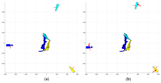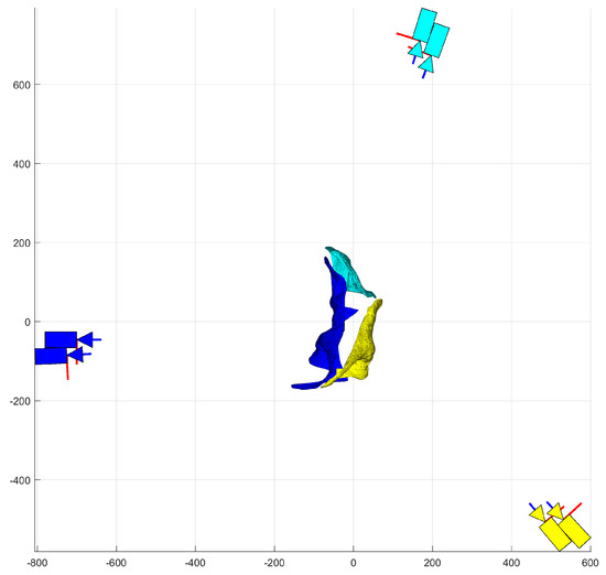 Extensive simulations were carried out using the Blender™ software [80] for object animation and camera representation. The VLFeat™ [81] library was used for image processing. MatLab™ was used to code the complete methodology. Six example simulations are presented herein to demonstrate the proposed methodology. Each simulation utilized a fixed stereo-camera pair.