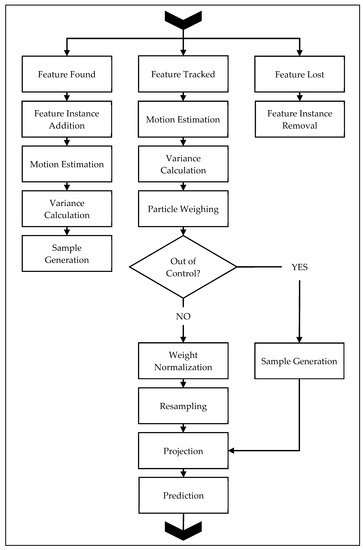 Points that are tracked for more than three consecutive demand instants are labeled as tracked and are processed through the feature tracked stream. As a new positional measurement becomes available at the current demand instant, the state-space measurement for a given point is calculated by Equations (8) and (9), and stored in the state-space measurement history. Thereafter, for each jth point, the set of projected particles Qj+ is loaded, and each nine-dimensional particle is weighed against the current state-space estimate xj*.