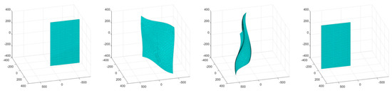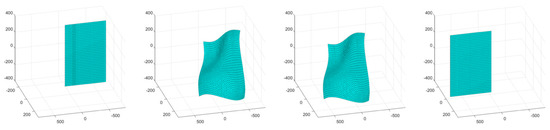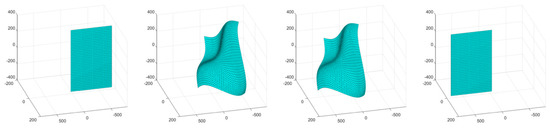 The first simulation consisted of an object surface undergoing a wave-like stretching deformation with a linear translation. A four-frame movie-strip of the object is presented in Figure 4. This simulation tested the methodology’s ability to handle a more complex form of surface deformation with global motion. The errors remained under 1.3% for all three error metrics, and the total number of tracked and triangulated points remained fairly stable with a slight increase (Figure 5). The slight increase in error from the third simulation is attributed to the compounded motion experienced by every tracked and triangulated point. Specifically, in the previous simulation, the tracked points only moved in the wave motion, while, in this example, they also moved perpendicularly to the wave motion, thus increasing the relative prediction errors.