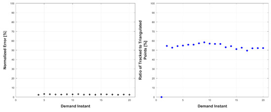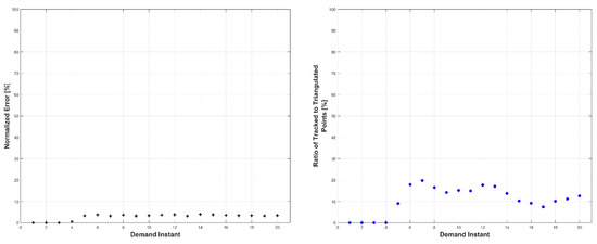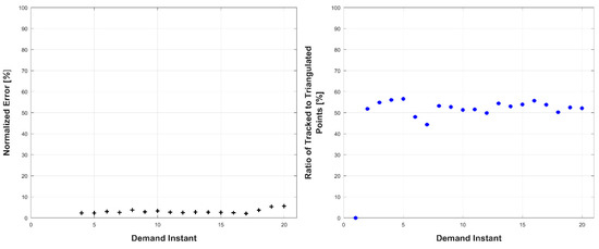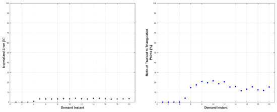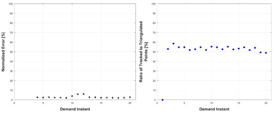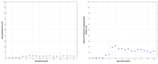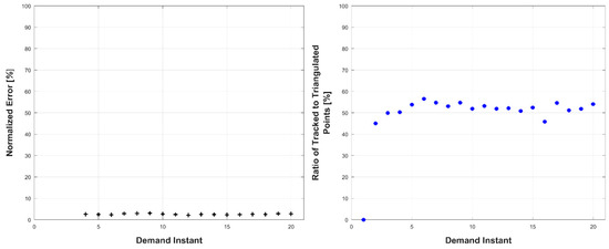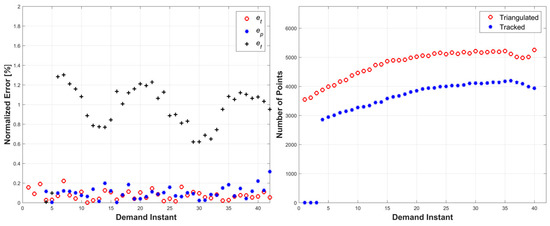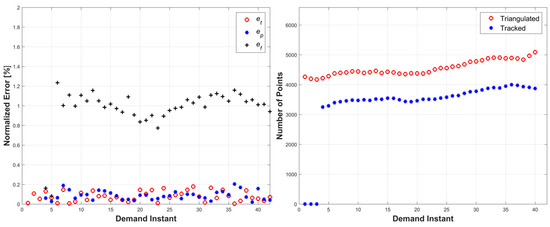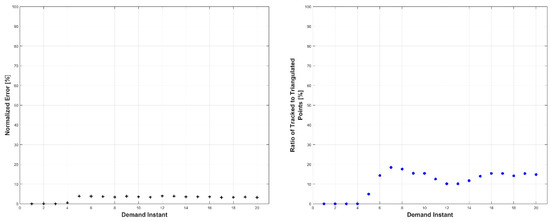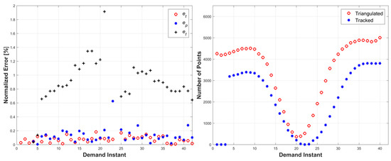 Left: triangulation, prediction, and relative prediction error metrics for each demand instant. Right: total number of tracked and triangulated points for each demand instant.