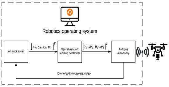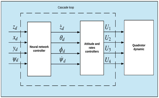 The weights are obtained by using a supervised learning mechanism; the training process aims to minimize the error between the user input commands and the kinematic output vector of the neural network depending on the quadrotor’s state. The neural network is illustrated in Figure 2.