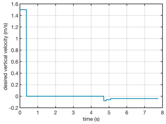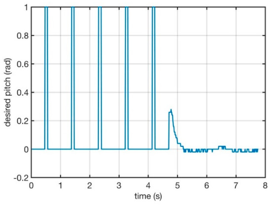 For the exploration mode, the drone is commanded to follow a predefined trajectory using reference angles. Figure 4 and Figure 5 illustrate the pitch angle and the roll angle references, respectively. In addition, the vertical velocity reference is presented in Figure 6. The controller has to drive the quadrotor system towards the given reference signals to explore the area and to detect the landing platform.