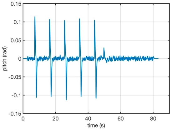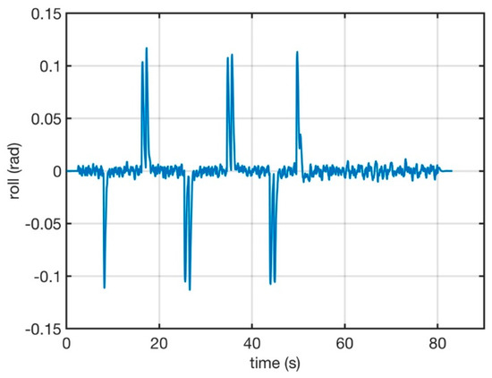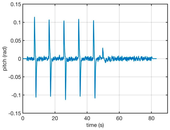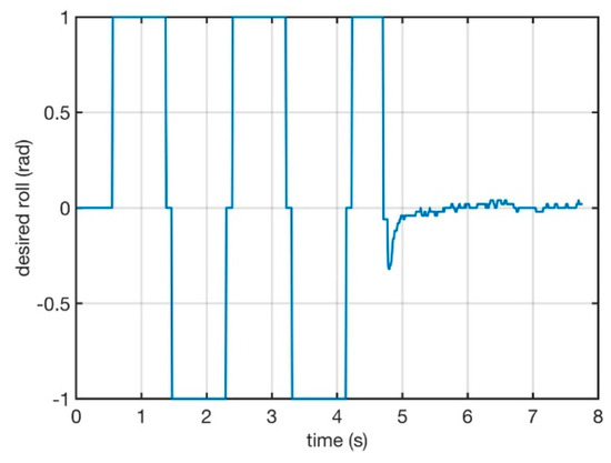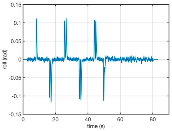 The simulated roll and pitch angles are presented in Figure 12 and Figure 13, respectively, and show that the angles are bounded and the coupling phenomena of the gyroscopic effect have been successfully eliminated. It can be observed that the controller maintains the system angles brought back to equilibrium rapidly, thus demonstrating the agility of the drone with the proposed controller.