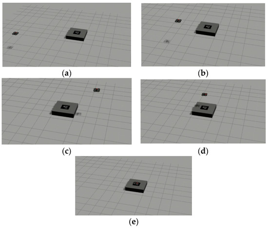 The autonomous landing on a moving target simulation in a Gazebo environment showing the start of the simulation in (a) until landing on the target in (e).