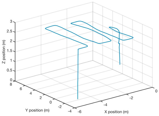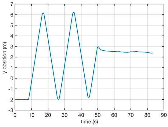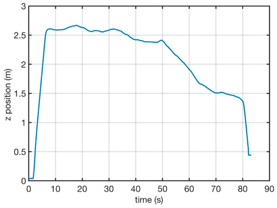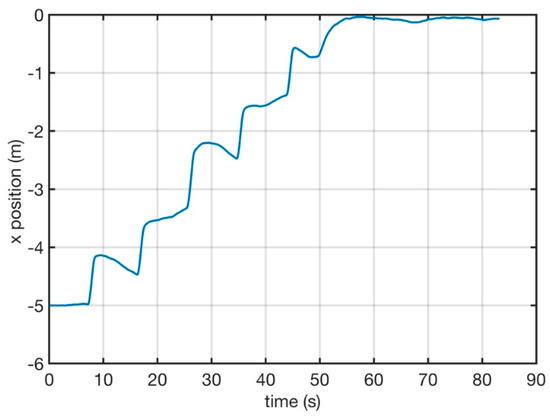 The simulation of the system resulted in a successful landing on the fixed target as shown in Figure 7. The resulting simulation 3D exploration trajectory of the quadrotor is illustrated in Figure 8 proving the controllability of the system and the ability of the controller to drive the quadrotor to the defined reference angles. Furthermore, Figure 9 and Figure 10 present the convergence of the x–y positions respectively to the target position after the detection of the landing platform. The convergence of the quadrotor altitude is illustrated in Figure 11, which shows the gradual landing of the quadrotor to the target platform. Hence, the designed intelligent controller has used the published target positions from the target tracking package to drive the drone to land successfully on the target position.