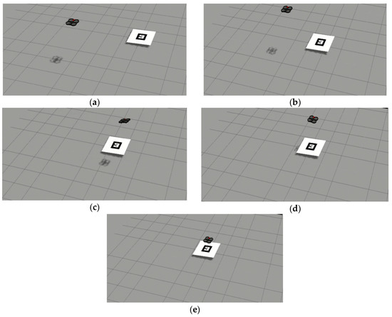 The autonomous landing on a fixed target simulation in a Gazebo environment showing the start of the simulation in (a) until landing on the target in (e).