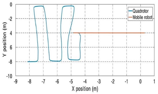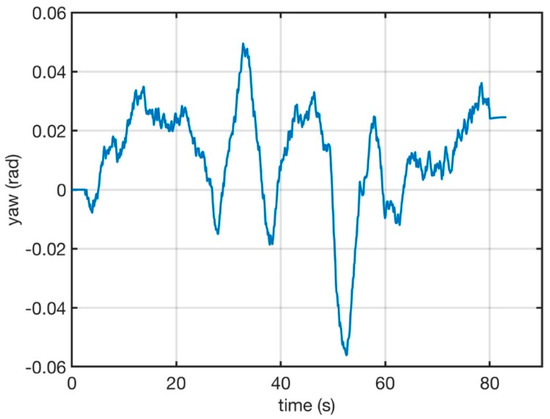 The flight data have been recorded and fed over the wireless connection into the computer running ROS and the recorded 2D and 3D trajectories of the quadrotor and the mobile robot are presented in Figure 16 and Figure 17, respectively, showing the successful landing on the moving target. In addition, the roll, pitch and yaw angles are presented in Figure 18, Figure 19 and Figure 20, respectively. It can be noted that the quadrotor has taken off and followed the predefined exploration trajectory to search for the moving landing platform whilst the tracking algorithm is executed. The platform was then detected and the quadrotor started to follow a gradual descending trajectory for a smooth landing on the moving platform. The recorded angles of the quadrotor system are bounded, showing the robustness and feasibility of the proposed intelligent controller.