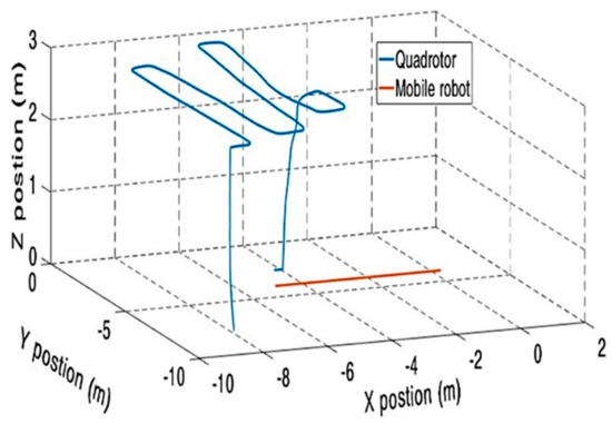 As previously mentioned, the quadrotor is programmed to have three operating modes: the exploration, target tracking, and autonomous landing modes. In this simulation scenario, the quadrotor takes off from an initial starting position and then starts the exploration mode with a predefined search pattern until a target is detected. Once the target markers are identified, the quadrotor starts the tracking mode with the Ar_Track_alvar package to estimate the position and orientation of the target and, hence, the neural network controller, the autonomous landing phase uses the published target positions to drive the drone to land precisely on the target.