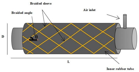 The construction of the PMAs formed its behaviour as a contractor or an extensor actuator. The basic structure of the pneumatic muscle actuator is illustrated in Figure 1. L and D are the length and the diameter of the actuator respectively, while the initial values are denoted as L0 and D0, where their values vary according to the dimensions of both the inner tube and the braided sleeve. The braided angle θ at relaxed condition (unpressurised) controls whether the actuator will act as an extension or contraction muscle. The braided angle less than 54.7° leads to produce a contractor PMA [28], while, the actuator behaves as an extensor PMA if the initial braided angle is greater than 54.7° [15,27,39].