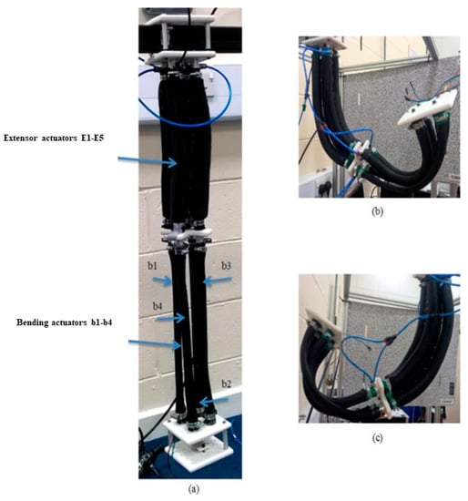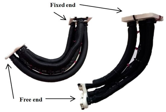 Five extensor PMAs have been used to build the top section of the soft robot arm. The suggested structure of the top section provides a bending performance (as explained in Section 2), in addition to the elongation behaviour of the proposed arm.