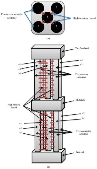 In this section, we designed and built two continuum arms by using either 4-contractor PMAs or 4-extensor PMAs, as shown in Figure 2.