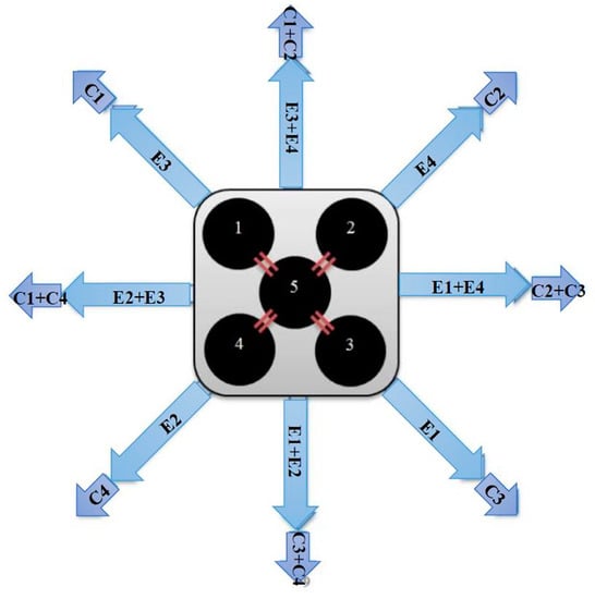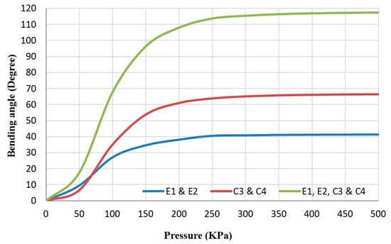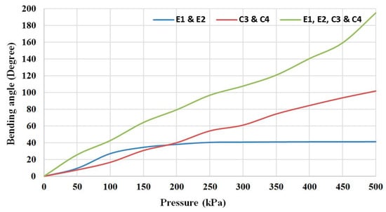 The bending performance of the proposed soft arm can be achieved by either pressurising one actuator (but not the centre PMA because the thread prevents its bending) in the top section, one in the bottom section or both. Other possibilities of bending could be achieved through a combination of either two, three or more PMAs, in both the top and the bottom sections. Referring to Figure 4a, the probable bending performances can be explained in Figure 5, where (e) refers to the extensor actuator and (c) refers to the contractor actuator. Figure 6 illustrates the bending angle of the free end in three patterns.