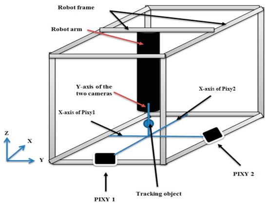 The Pixy camera only tracks x and y positions for a predefined object. To solve this issue, two cameras have been used in two positions to get a 3D reading of the tracking object. A blue ball has been chosen as a tracking object and it is attached to the end of the robot arm so as to be seen as a blue circle at all times. Figure 9 explains the layout of the cameras and the ball.
