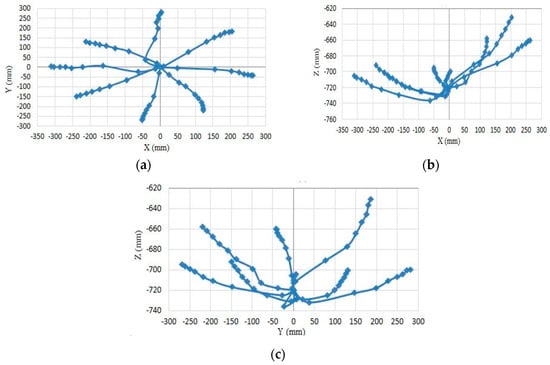 The mapping data of x-y, x-z and y-z are illustrated in Figure 10a–c for different pressurising patterns in the nine actuators at pressure steps from 0 to 500 kPa. The results show non-symmetrical movements due to the difficulties of build a symmetrical continuum arm and the friction between the parallel actuators.
