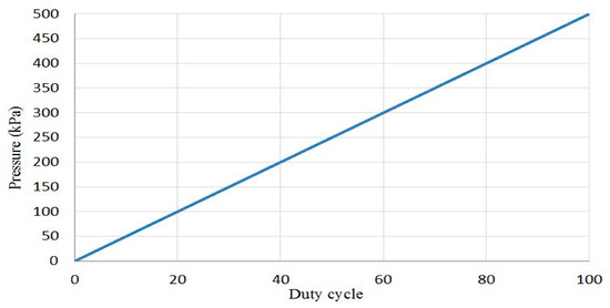 where y is the pressure in kPa, the number (500) represents the maximum air pressure in kPa, u is the controlled duty cycle and the (98) refers to 98% of the maximum duty cycle for the control signal to avoid the continuous supply to the solenoid valve. Figure 12 shows the relation between the actuator air pressure and the duty cycle.