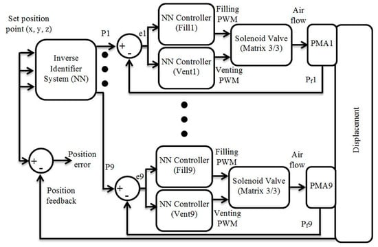 The pressure control has been applied to control the offline position of the soft arm at no load. Nine pairs of NN controllers are used to control the pressure in the nine actuators, where each pair contains two controllers for filling and venting the PMA, respectively. In each pair, the individual controller work depends on the error of air pressure. Figure 11 illustrates the flowchart of each pair.