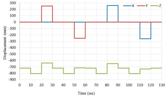 In this pattern, we wanted to get movement along the X-axis by 260 mm and Y-axis by 252 mm; the z displacement is the result of these two actions. Therefore, the control system which is described in Figure 13 will control the pressure in all actuators to track the desired position pattern. The pressure outputs from the inverse identifier system and their feedback values have been illustrated in Figure 15, while Figure 16 shows the position set point and the position feedback at no-load, and Figure 17 shows the position error.