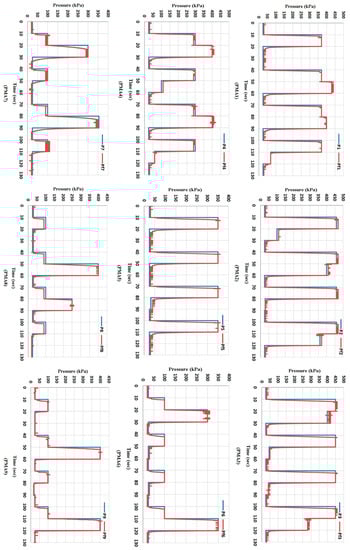 The output and feedback air pressure for the nine actuators, which have been programmed to control the position of the multi-function soft arm at no-load by using the cascaded control system.