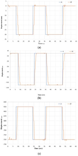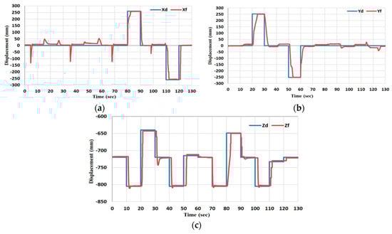The reference and the feedback positions at 300 g. (a) Is the X and Xf position. (b) Is the Y and Yf position. And (c) Is the Z and Zf position.